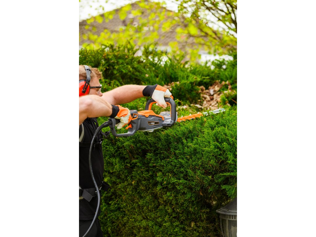 - Model HT640-P využívá napájení Plug-In, které umožňuje připojení k batohové baterii nebo přenosné baterii se systémem nosných popruhů, což znamená méně zátěže na ruce a delší pracovní dobu bez přerušení. Variabilní rychlost otáček (až 4000 ot./min) umožňuje přesné přizpůsobení práce různým typům dřevin.