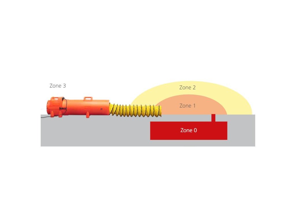 - Kombinace ventilátoru a uzemněného potrubí je vhodná pro větrání potenciálně výbušných oblastí.
