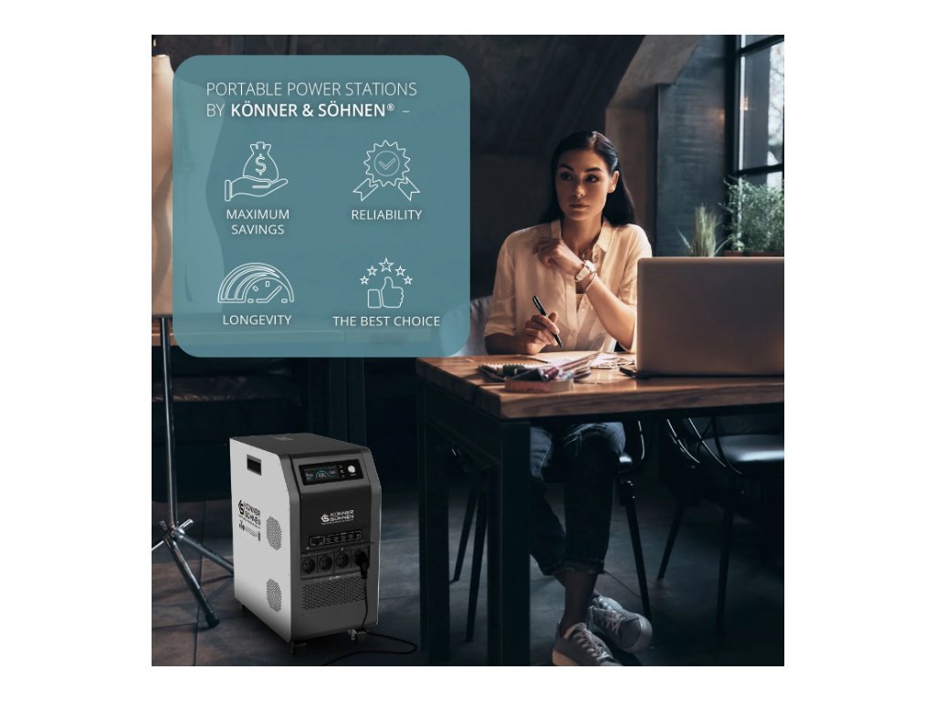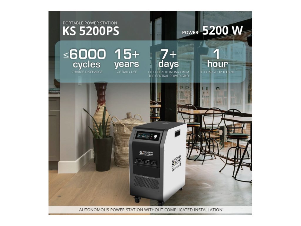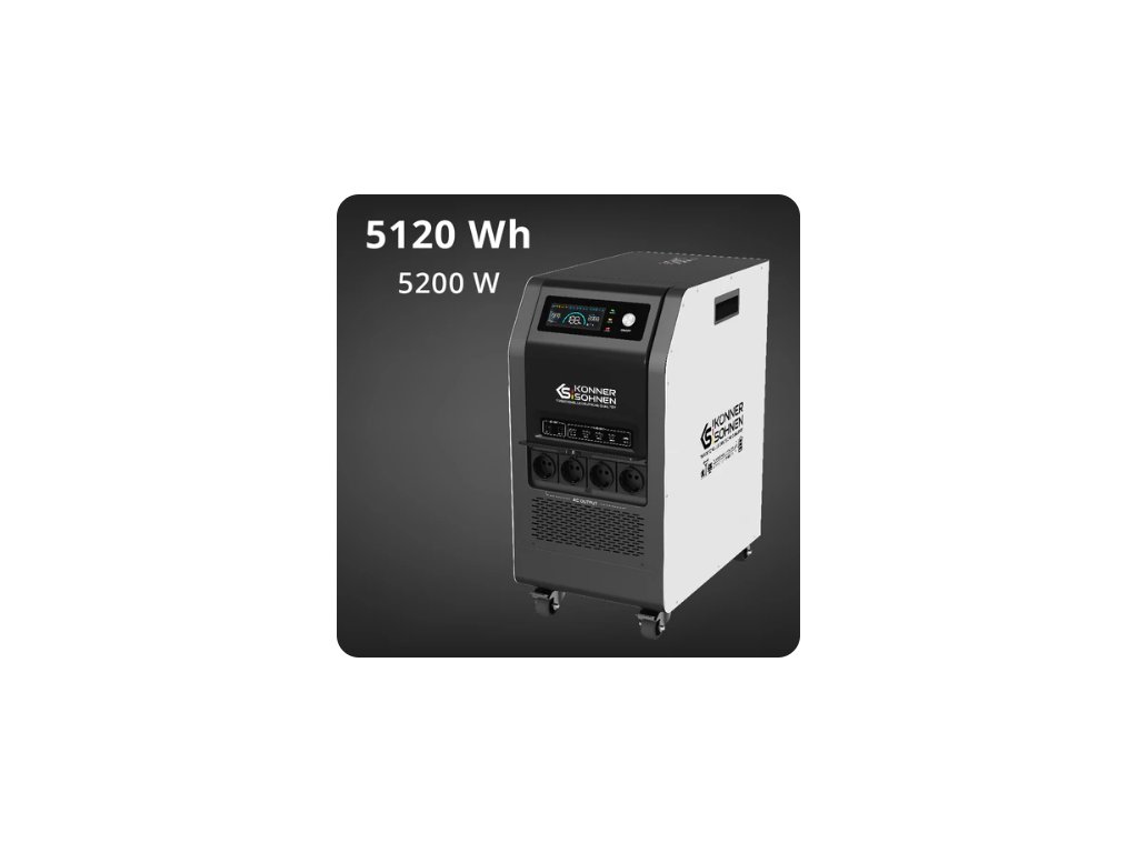 Bateriová stanice Könner & Söhnen KS 5200PS je navržena pro profesionální i domácí využití jako záložní zdroj energie i jako hlavní napájení v místech bez sítě. Kombinuje výkonný měnič 5,2 kW, inteligentní MPPT solární regulátor a LiFePO₄ baterii o kapacitě 5120 Wh, čímž zajišťuje dlouhou výdrž, bezpečnost a vysokou efektivitu provozu.