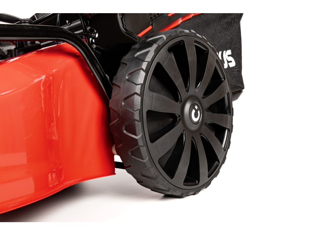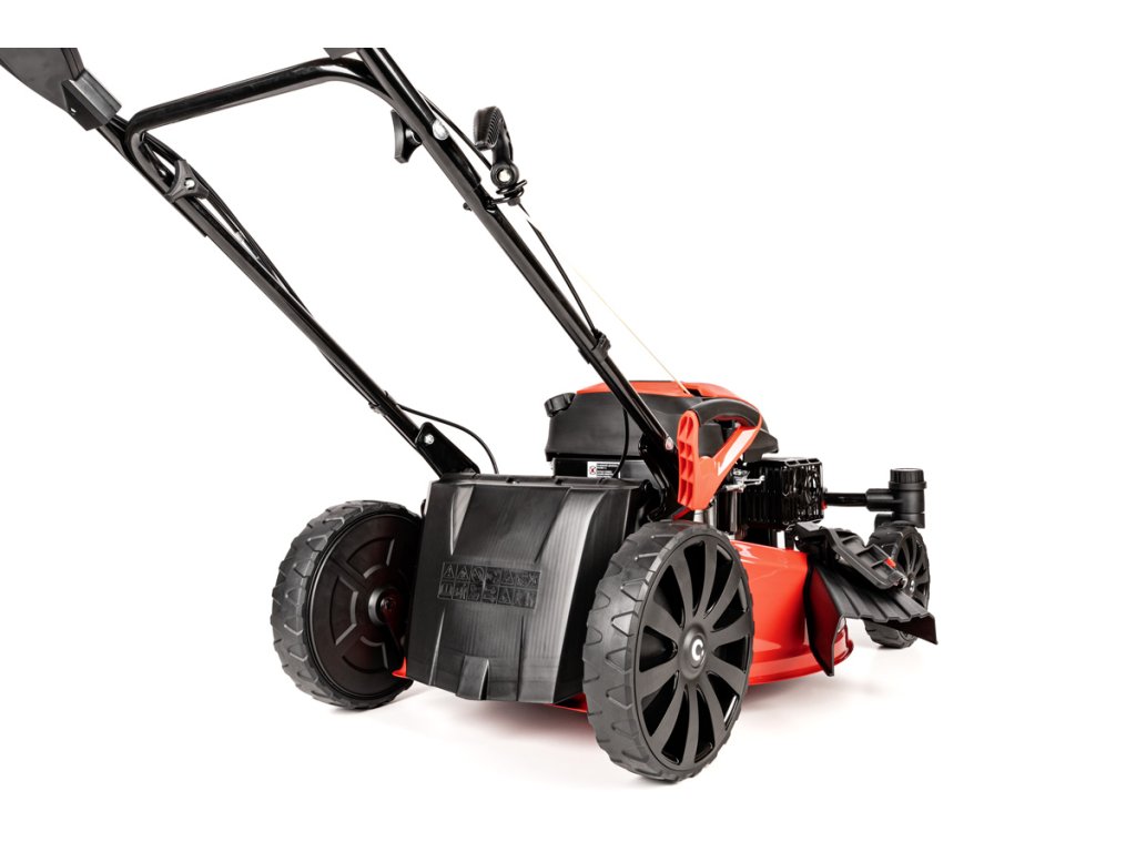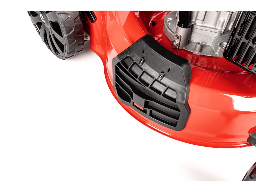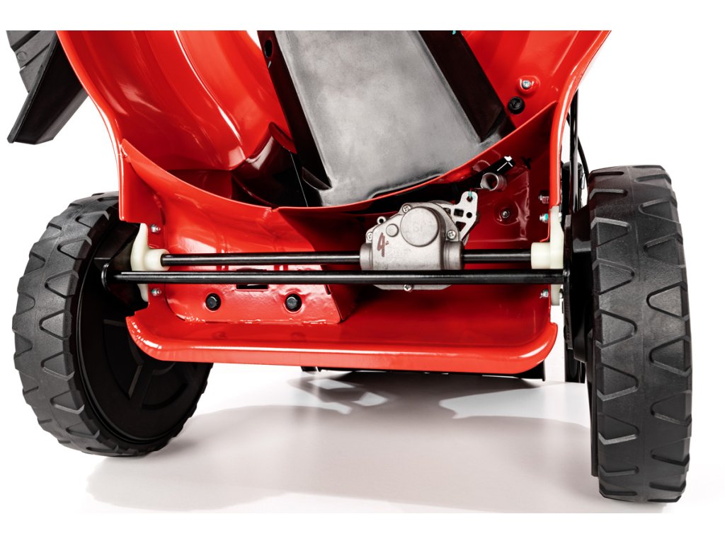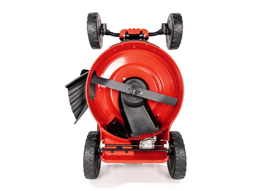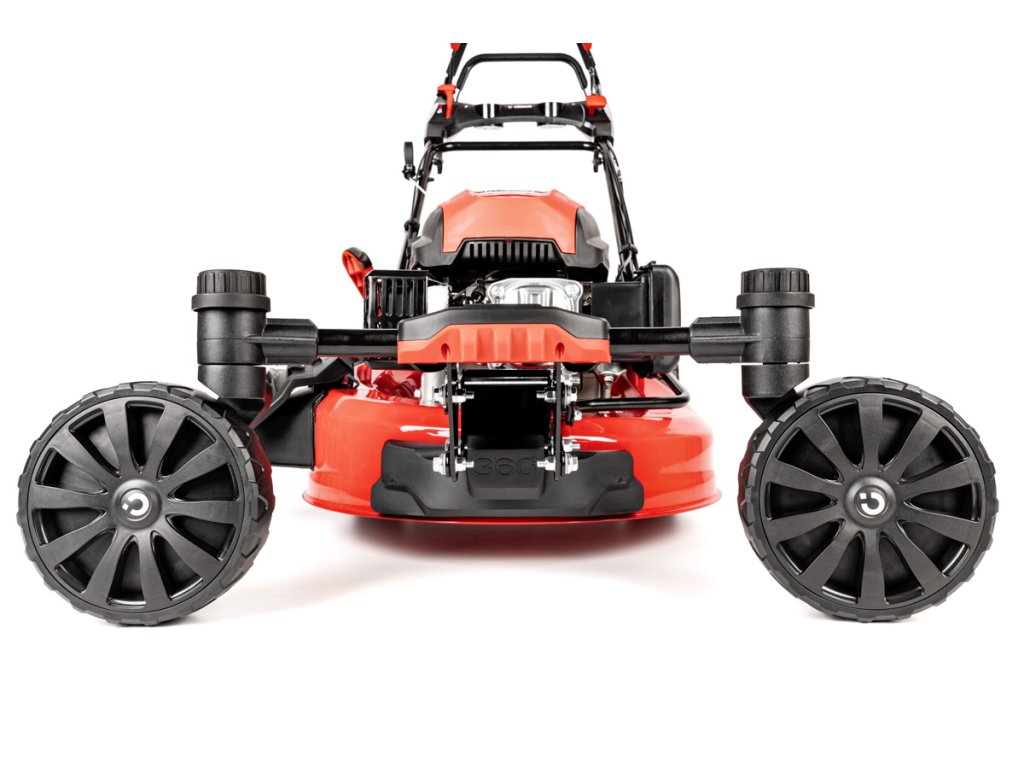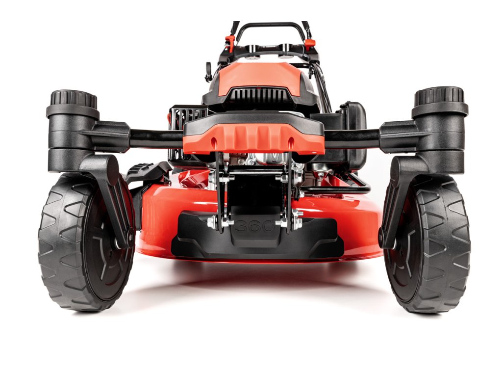 - Díky velkým zadním kolům (28 cm) a předním otočným kolům (20 cm) je manipulace extrémně snadná i na nerovném povrchu. Model je také vybaven přípojkou na hadici pro snadné čištění, což usnadňuje údržbu po sekání.