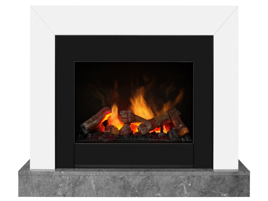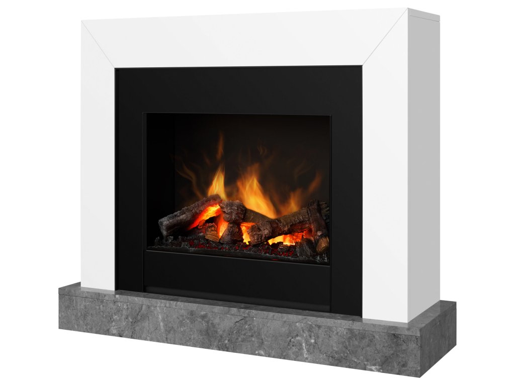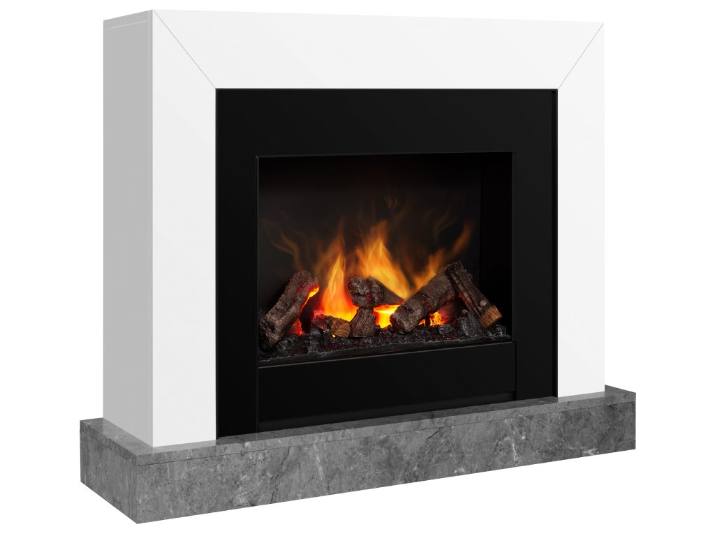 Elektrický krb se systémem hoření Opti-Myst a moderním ostěním v bílém lesku s černým rámečkem krbové vložky a šedým mramorovaným podstavcem.