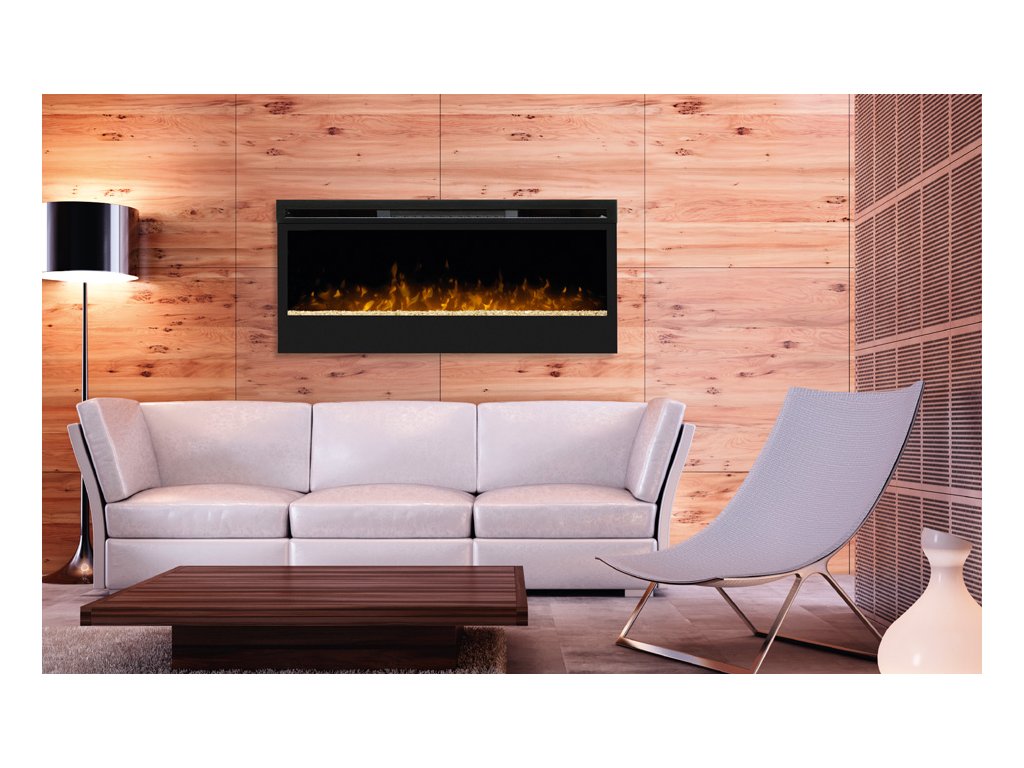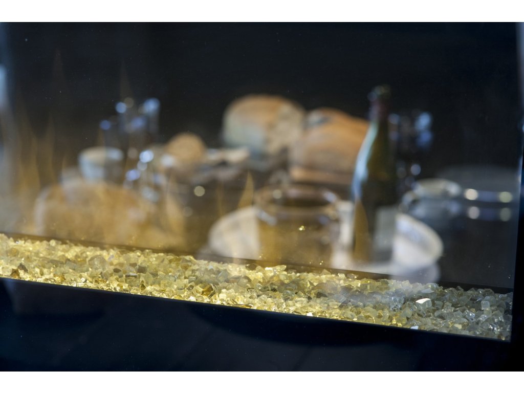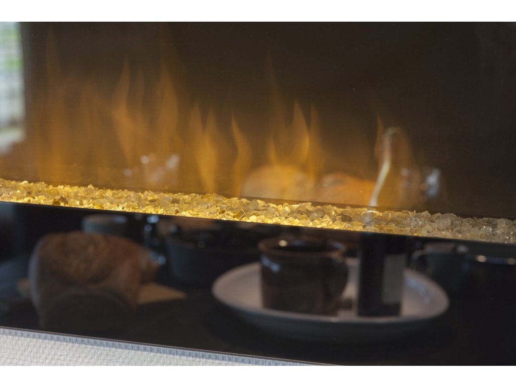 Bezrámový "širokoúhlý" vestavěný krb s realistickým vzorem plamene. Dekoraci ohniště z rozbitých skleněných střepů lze nahradit jakýmkoli suchým dekoračním materiálem (minimální průměr: 6 mm). Tato možnost vám umožní dát krbu Dimplex vlastní styl.