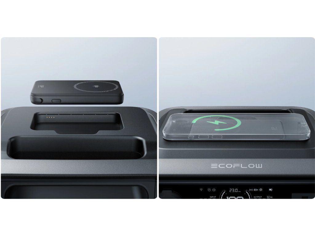 - Součástí této verze je i magnetická powerbanka EcoFlow RAPID s kapacitou 5000 mAh, která podporuje bezdrátové Qi2 nabíjení i kabelový USB-C výstup. Je ideální na cesty a umožňuje rychlé napájení i během pohybu.