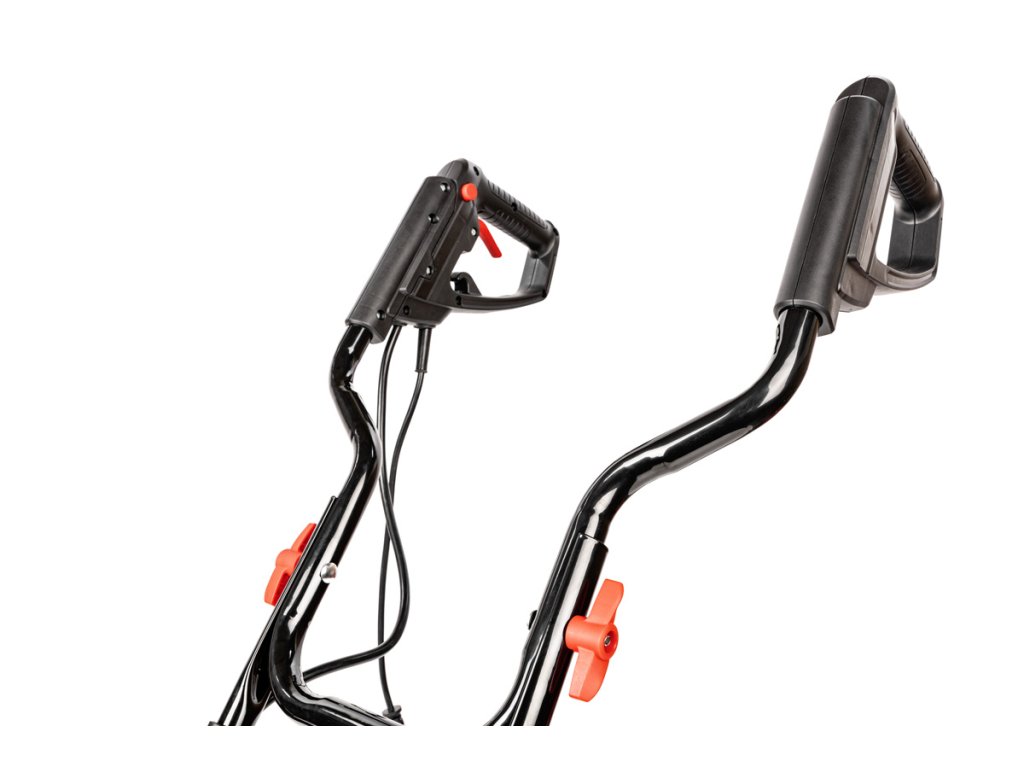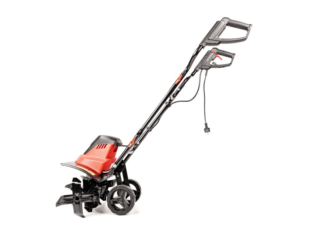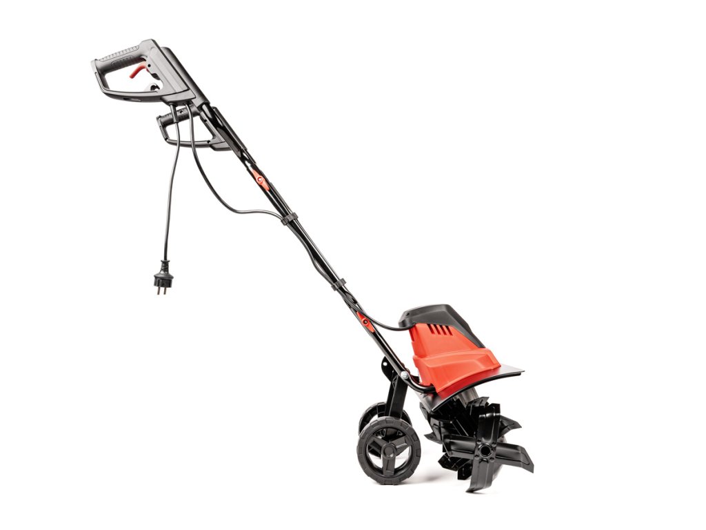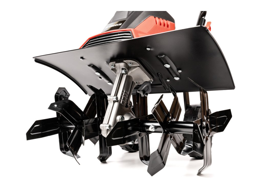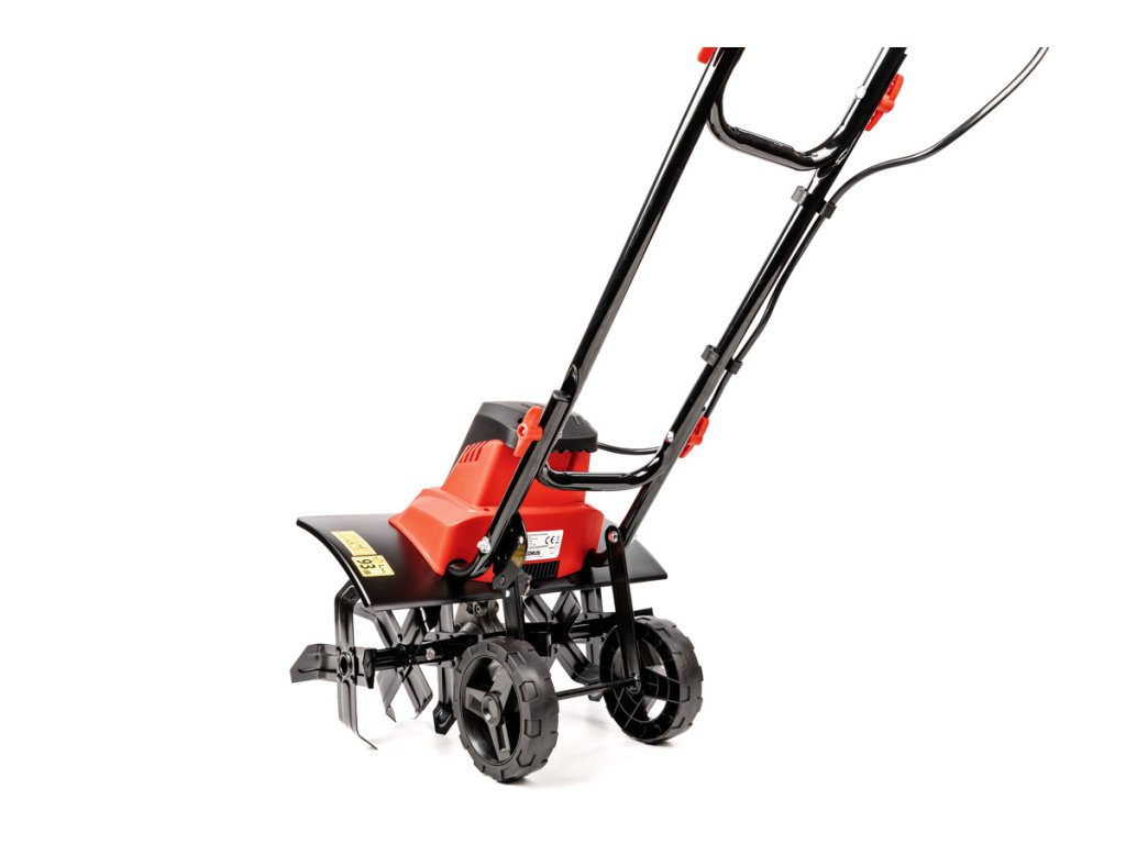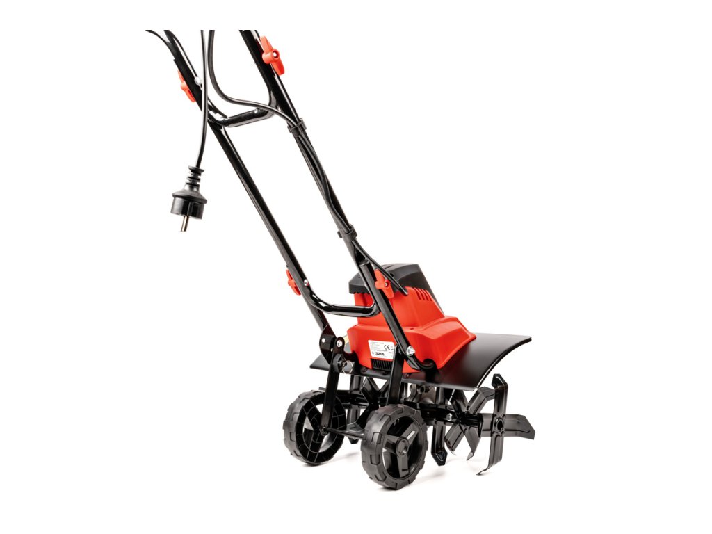 - Zařízení je vybaveno šesti čepelovými noži o průměru 205 mm, které umožňují zpracování půdy do maximální hloubky 220 mm. Snadná manipulace a pohodlná obsluha jsou zajištěny ergonomickými držadly a transportními koly, která usnadňují přesun kultivátoru.