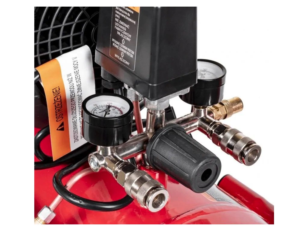 - Kompresor je vybaven ochranou proti přehřátí, tlakovým spínačem, regulátorem tlaku, manometry, ventilem pro odvod kondenzátu a kolečky pro snadnou manipulaci.