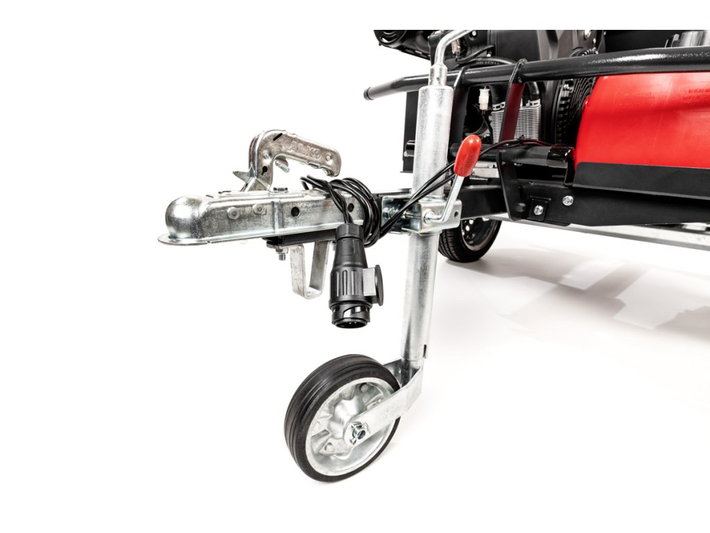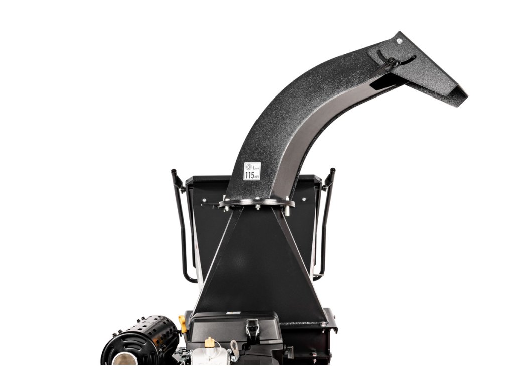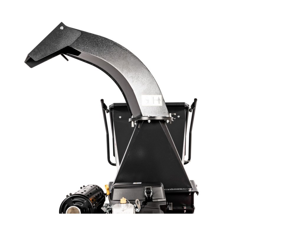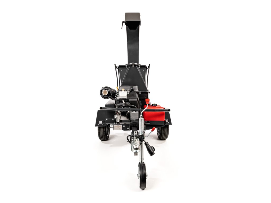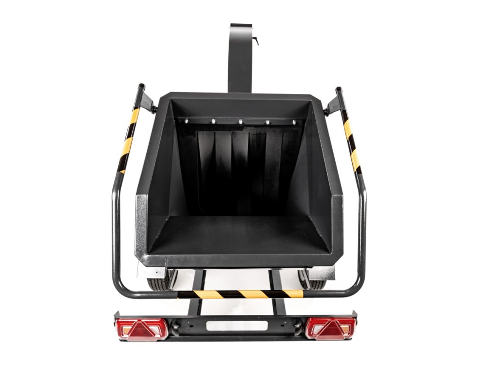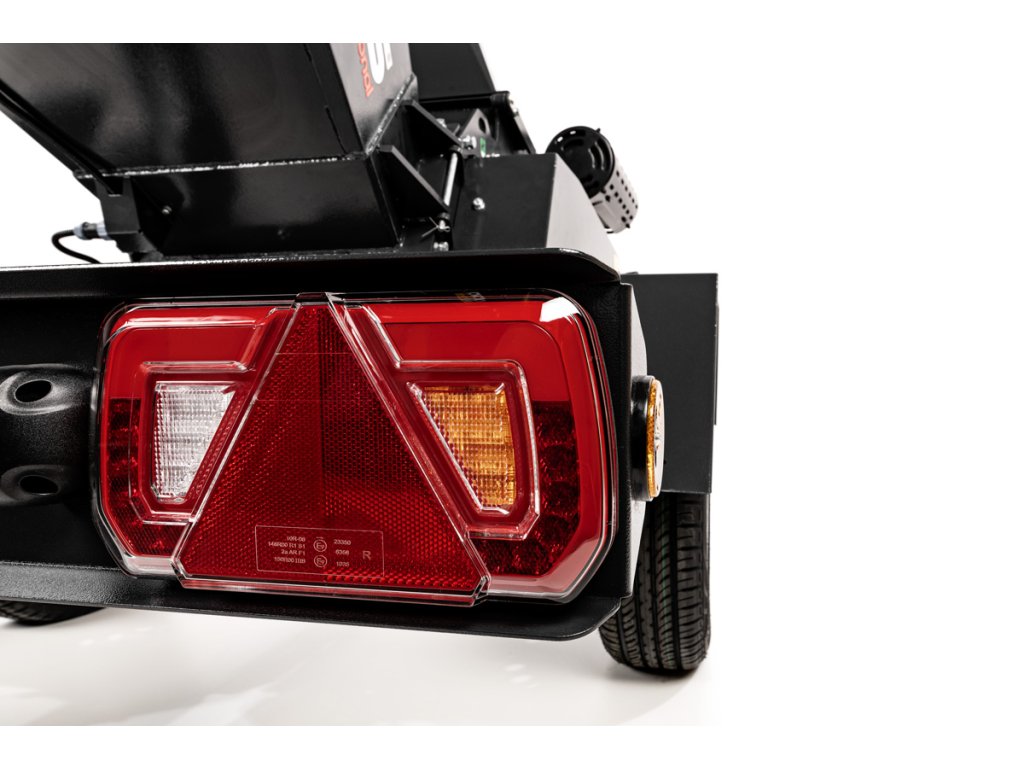 - Odhozový komín lze otáčet o 360° a deflektor upravit v rozsahu 90°, což usnadňuje řízení směru výhozu štěpky. Celý stroj je namontován na podvozku AL-KO s podporou připojení k tažnému zařízení (kategorie přívěs A/A – do 750 kg), včetně světel, podpěrného kola a blatníků.