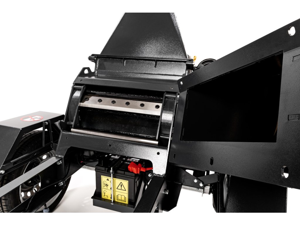 - Drticí buben s dvěma oboustrannými noži a jedním pevně uloženým kovadlinkem se otáčí rychlostí až 2200 ot./min, přičemž štěpkovač si poradí s větvemi o průměru až 130 mm. Materiál je podáván samotížně (gravitací) bez nutnosti hydraulického vkládání, což snižuje provozní náročnost.