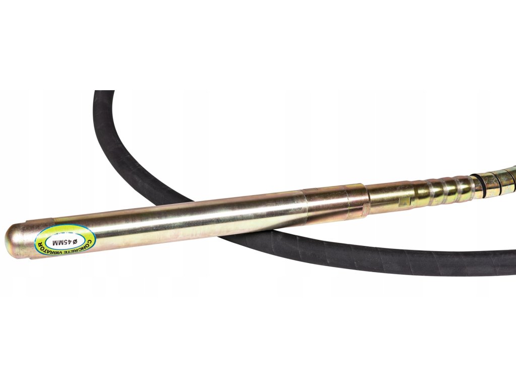 - Zařízení je osazeno vibrační hadicí o průměru 45 mm a délce 6 metrů, která umožňuje pohodlné zhutňování betonu i v hlubokých bedněních nebo úzkých sloupech. Odolná konstrukce z kvalitní oceli, ochranný rám motoru, nízká hmotnost motorové jednotky (21 kg) a rychlospojka hadice usnadňují manipulaci a transport.