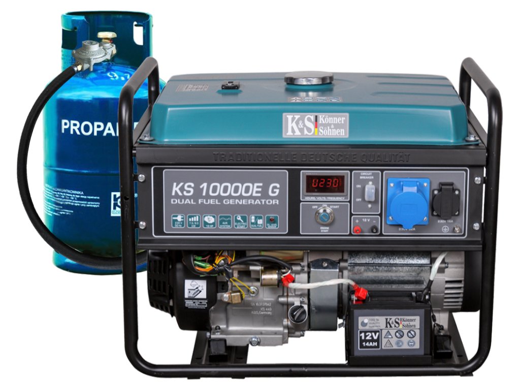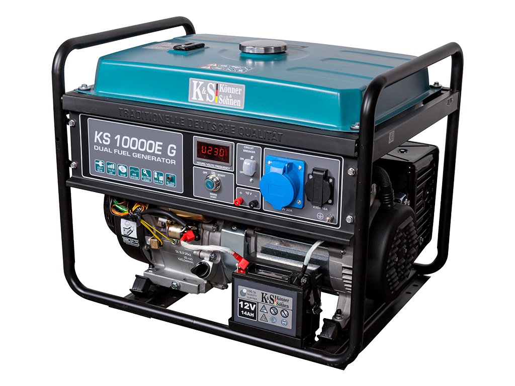 Elektrocentrála KS 10000E G řady DUAL FUEL pracuje jak na benzín, tak na zkapalněný plyn (propan-butan). Díky své účinnosti je tak šetrná k životnímu prostředí a pohon na plyn zvyšuje životnost motoru. Výkonný jednoválcový vzduchem chlazený čtyřtaktní motor K&S zajišťuje stabilní a spolehlivý provoz elektrocentrály.