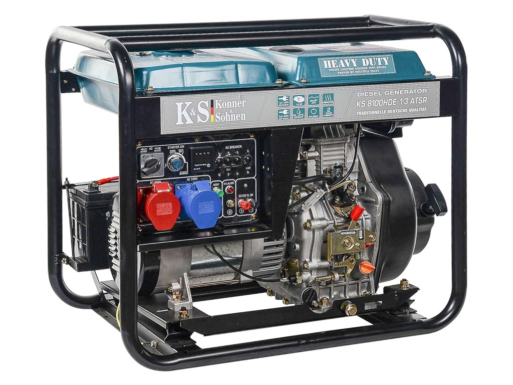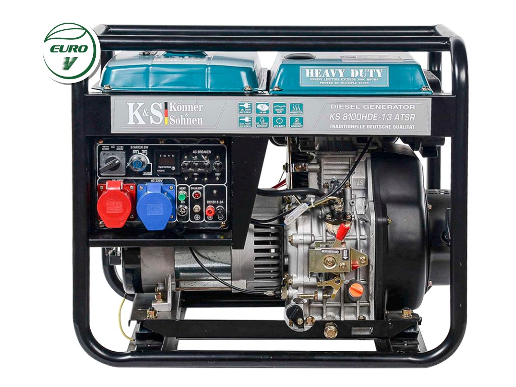 KS 8100HDE 1/3 ATSR (EURO V) je výkonná naftová elektrocentrála řady HEAVY DUTY, která se pyšní robustní zesílenou konstrukcí, jež chrání nádrž před poškozením i během přepravy. Je vybavena výkonným značkovým motorem Könner & Söhnen, který lze použít nejen jako záložní zdroj energie, ale i k nepřetržitému provozu. Mimo jiné je elektrocentrála vybavena předehřívačem, který umožňuje snadné spuštění elektrocentrály i v zimě. Inteligentní stabilizační systém AVR umožňuje udržovat konstantní napětí 230 V a chrání tak elektrocentrálu před nežádoucími zkraty. Tento model je navíc vybaven systémem fázového spínání VTS, díky němuž není potřeba kupovat dvě samostatné elektrocentrály. Tento systém dokáže jednoduše přepínat mezi fázemi - 230 V (jednofázový režim) a 400 V (třífázový režim).