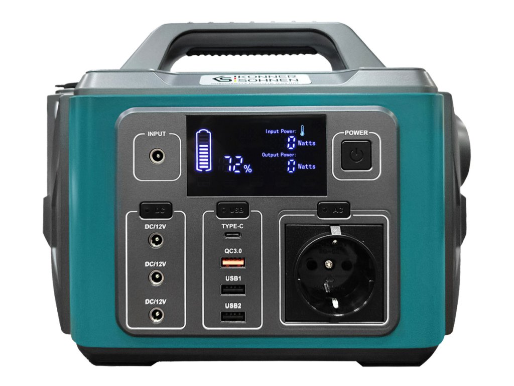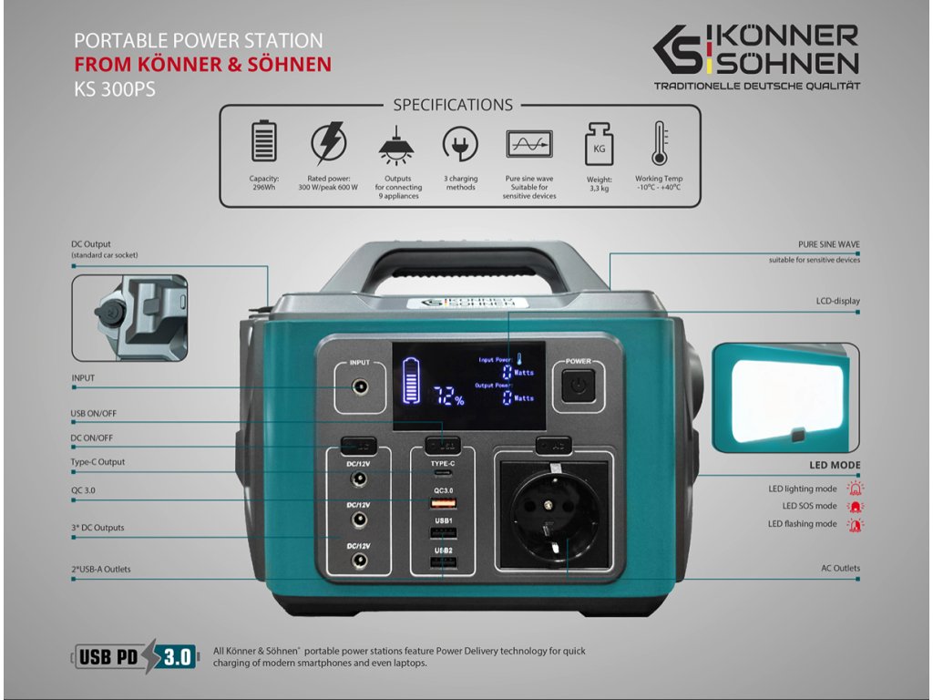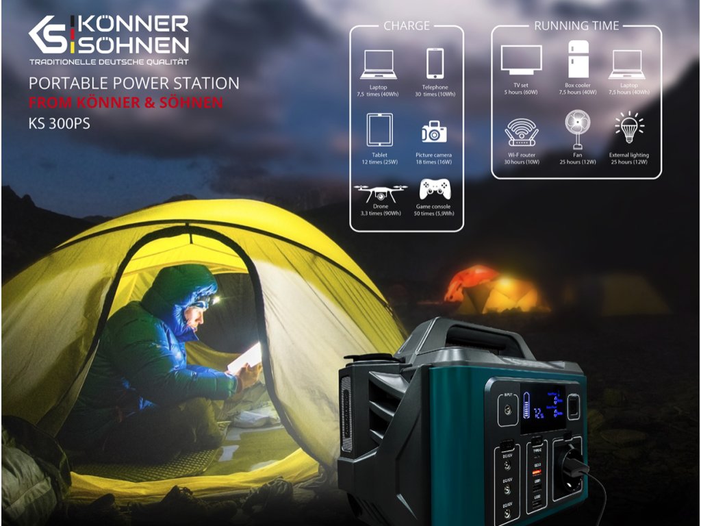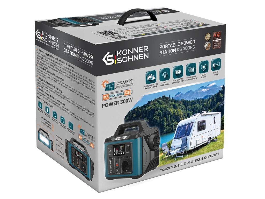 Přenosná bateriová stanice KS 300PS od společnosti Könner & Söhnen zajišťuje rychlé a spolehlivé nabíjení zařízení na cestách nebo při výpadku proudu. Tato napájecí stanice poskytuje dostatek energie pro zařízení, jako jsou chytré telefony, digitální fotoaparáty, tablety, drony, miniledničky, čerpadla na pneumatiky, ventilátory atd. Tato tiše běžící napájecí stanice napájí vaše elektrická zařízení, zatímco vy si užíváte volný čas.