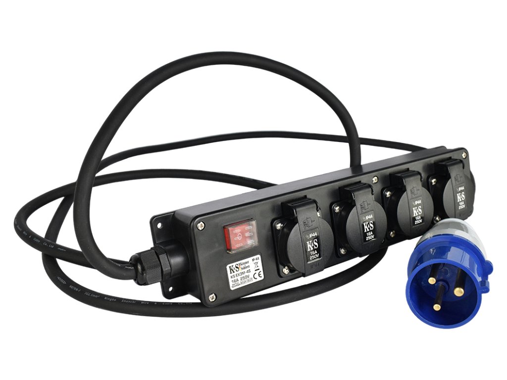 Adaptér KS EX3M-4S se čtyřmi zásuvkami a délkou kabelu 3,0 m se používá v případech, kdy je nutné připojit domácí spotřebiče s normální zástrčku 16A k zásuvce 32A, například v elektrocentrále. Má třídu ochrany IP44, což vám umožňuje používat adaptér venku i při vysoké vlhkosti díky ochraně proti náhodnému vniknutí kapiček vody a pevných částic.