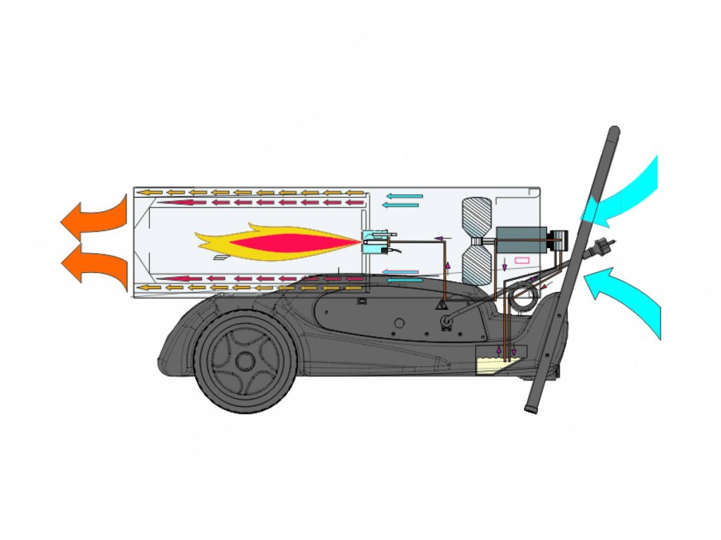 Toto profesionální naftové topidlo nabízí navíc doplňkovou možnost připojení předhřevu a pokojového termostatu. Po vypnutí stroje dochází k jeho dochlazení. Trojitá filtrace paliva a elektronický systém kontroly plamene fotobuňkou.