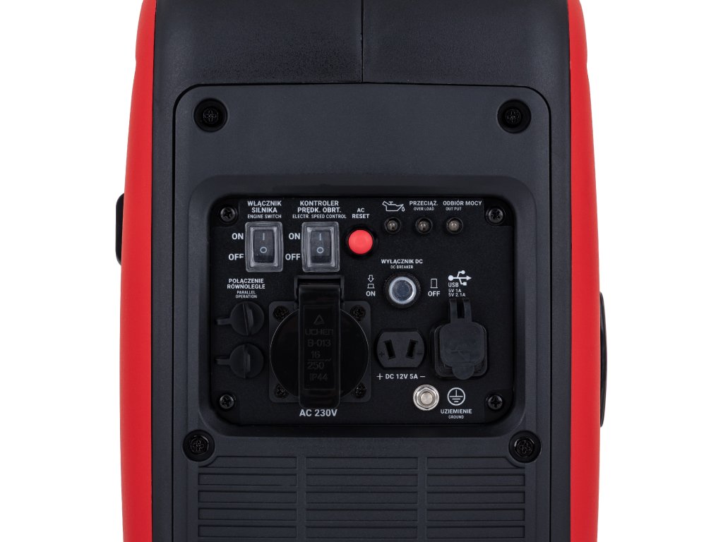 Elektrocentrála je vybavená dvěmi zásuvkami – jedna na 230 V a jedna na 12 V, do kterých lze připojit všechny standardní spotřebiče.