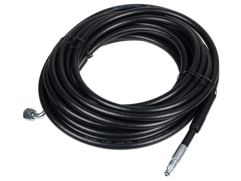 - Hadice je vyrobena z odolného a pružného materiálu, který odolává ohýbání a vysokému pracovnímu tlaku bez rizika prasknutí. Je zakončena připojovacími koncovkami, které umožňují rychlé a bezpečné připojení k pistoli i samotnému stroji.