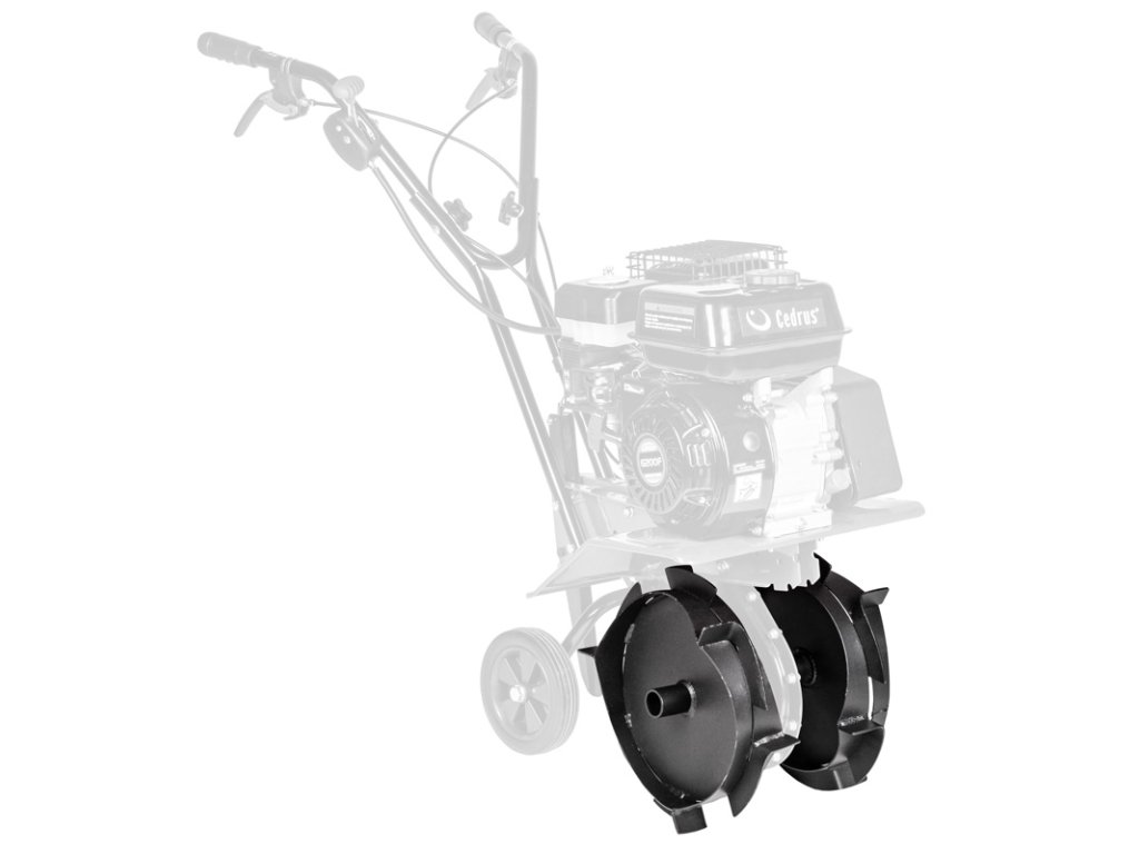 Tato sada obsahuje železná kola s plným ocelovým diskem a 6 lopatkami, která zajišťují vynikající záběr v půdě a umožňují práci v náročných podmínkách – jako je orání, hrobkování nebo použití s plečkou.